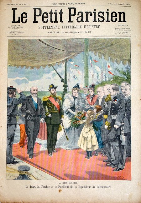 journal Le petit Parisien illustré A Dunkerkequ. Le Tsar, la Tsarine et le Président de la République au débarcadère.