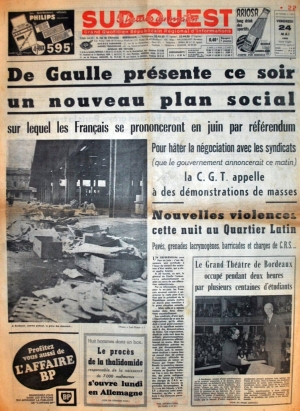 De Gaulle annoncerait : réferendum le 16 juin. Etudiants: nouvelles et violentes bagarres à Paris.